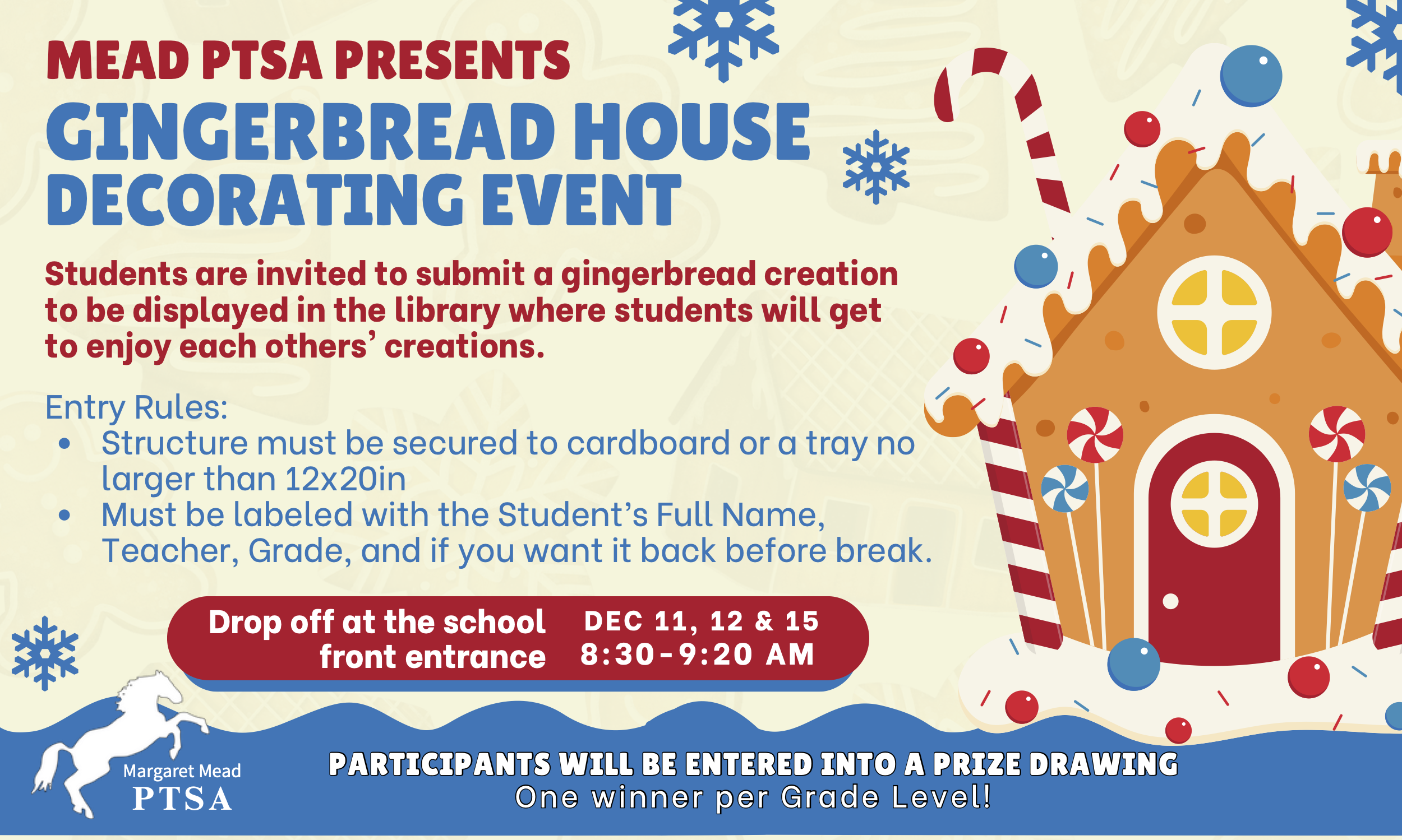 Please drop off at the school front entrance DEC 11, 12 & 15, 8:30-9:20 AM.
