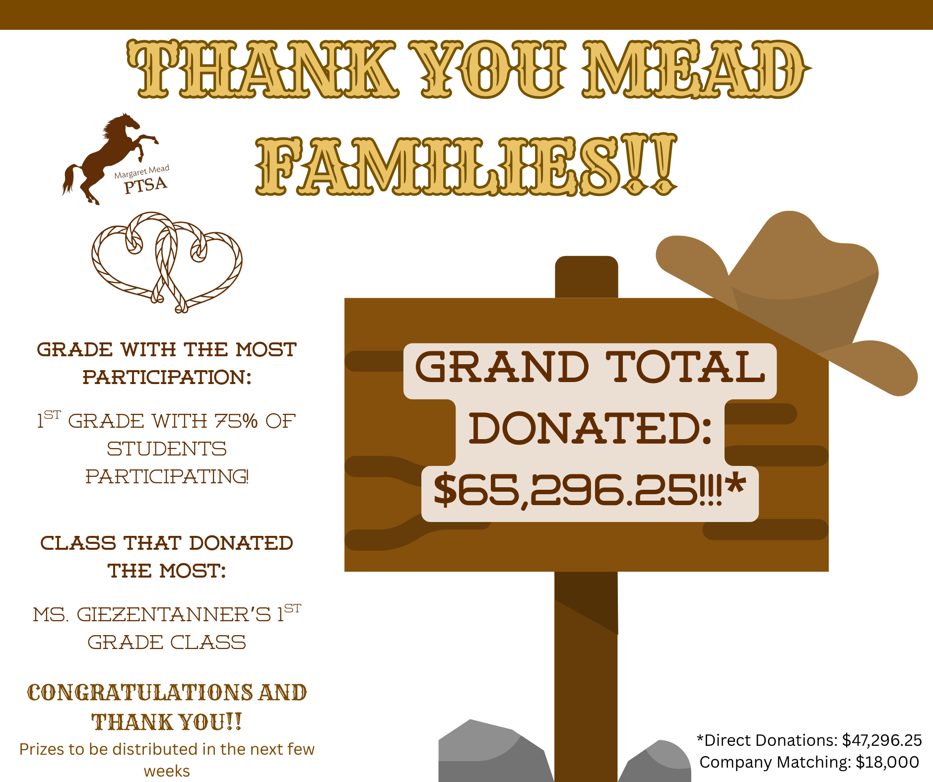 | October 13th-24th Our fundraising campaign begins on October 13th with promotional materials going home to families. Students and families have two weeks to collect donations! We’ll mark our Mid-Way Point with the Mead Glow and Lantern Festival and conclude our campaign on October 24th with our Stampede Fun Run. We send home the Fundraiser Details and a Donation Envelope with each student (Check your student’s backpack on 10/13). You can also find details in Principal Liz’s School Newsletter, the Mead Mustang report, and our Facebook Page. Students raise money via donations from parents, grandparents, family friends, etc., to earn prizes for themselves and their classrooms. Parents can submit corporate matching to their employer to increase donations. We ask for a suggested donation of $200 per student to help us reach our School Goal of $85K* (*which includes raising $20K in corporate matching). We’re thankful for our fundraising team of volunteers who spend countless hours to make this all happen. |